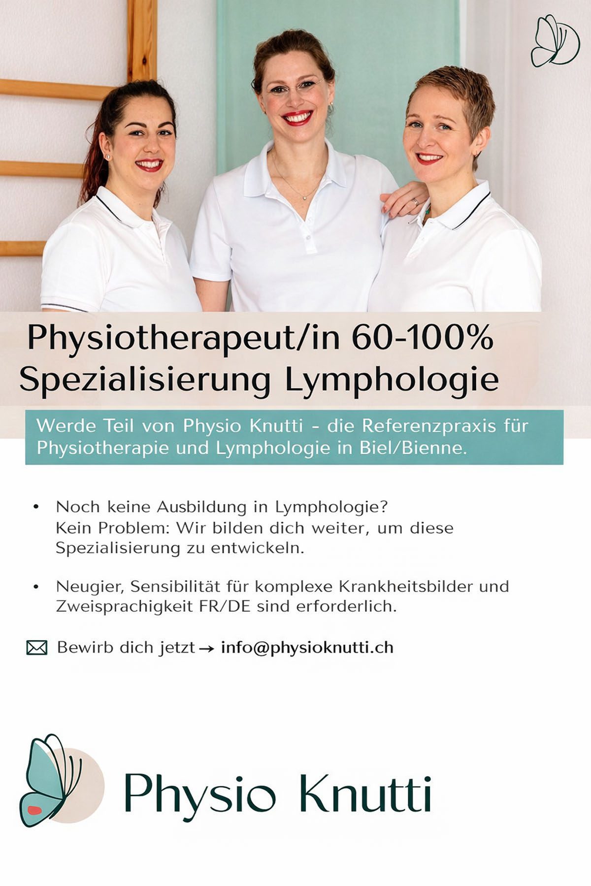 Zur Verstärkung unseres Teams suchen wir eine motivierte Physiotherapeutin oder einen motivierten Physiotherapeuten mit Interesse an der Lymphologie. Die Spezialisierung kann innerhalb der Praxis aufgebaut werden, mit entsprechender Begleitung und Weiterbildung. Neugier, klinisches Feingefühl sowie Zweisprachigkeit Französisch/Deutsch sind wesentliche Voraussetzungen, um Teil unserer Praxis zu werden.